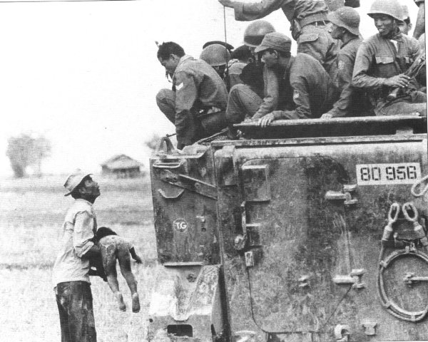 fra le braccia del padre che lo mostra a un gruppo di soldati sudvietnamiti.