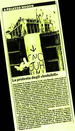 Contro il numero chiuso e per il reddito di cittadinanza gli Invisibili occupano il tetto di Palazzo Nuovo (sede delle facoltà umanistiche di Torino) calano striscioni e gettano un fantoccio che si schianta al suolo.