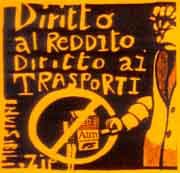 Una trentina di tute bianche sono partite dall’università e sono salite sui mezzi ATM (Azienda Torinese Mobilità) distribuendo volantini, adesivi e biglietti fac-simile che spiegavano il senso dell’iniziativa: "Rivendicazione del diritto alla mobilità, diritto al reddito di cittadinanza - contro il prossimo aumento delle tariffe". L’azione si è svolta senza complicazioni, raccogliendo il consenso di utenti e cittadini, lungo il tragitto che va da Palazzo Nuovo, sede delle Facoltà umanistiche, alla stazione FS di Porta Susa, passando per piazza Castello e arrivando infine a Porta Palazzo, luogo del più importante mercato cittadino. Sul lato esterno degli autobus e tram “liberati” veniva appeso di volta in volta, uno striscione lungo circa dieci metri: “ DIRITTO AI TRASPORTI…DIRITTO AL REDDITO “. |